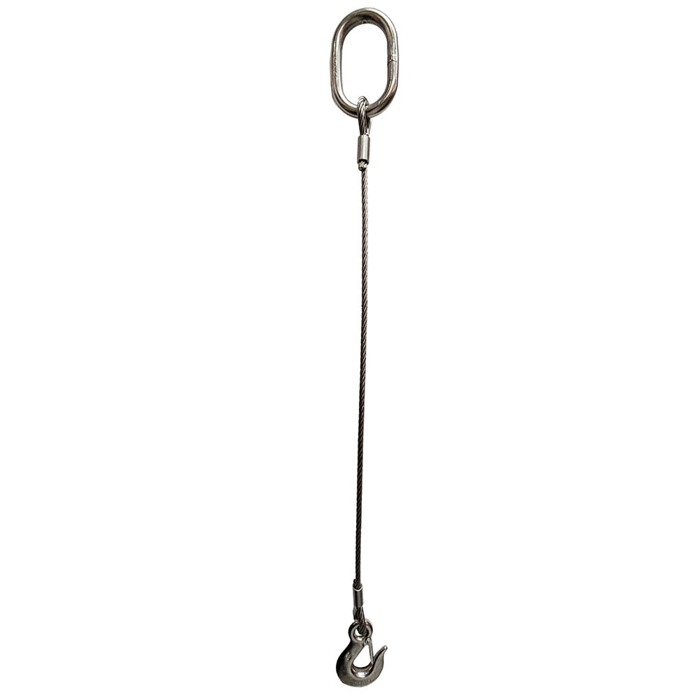 These wire rope lifting strops are manufactured in-house with AISI 316 stainless steel components, they are made from 8mm diameter 7x19 stainless steel wire rope and fitted with a master link and a 3/8" hook with a safety catch
