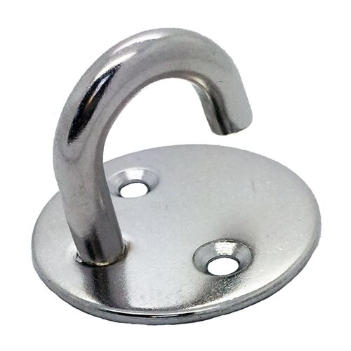 GS Products supply reliable A4 grade stainless steel round deck plates with hooks. These 5mm round deck plates have a hook and two countersunk holes for secure, professional fastening.