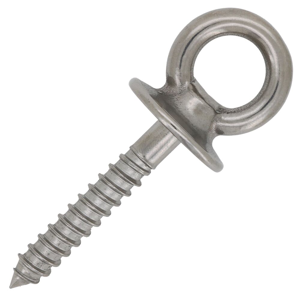 Marine grade stainless steel wood screw eye bolts with lag thread, comes with a round flush fixing plate underneath the eye.
