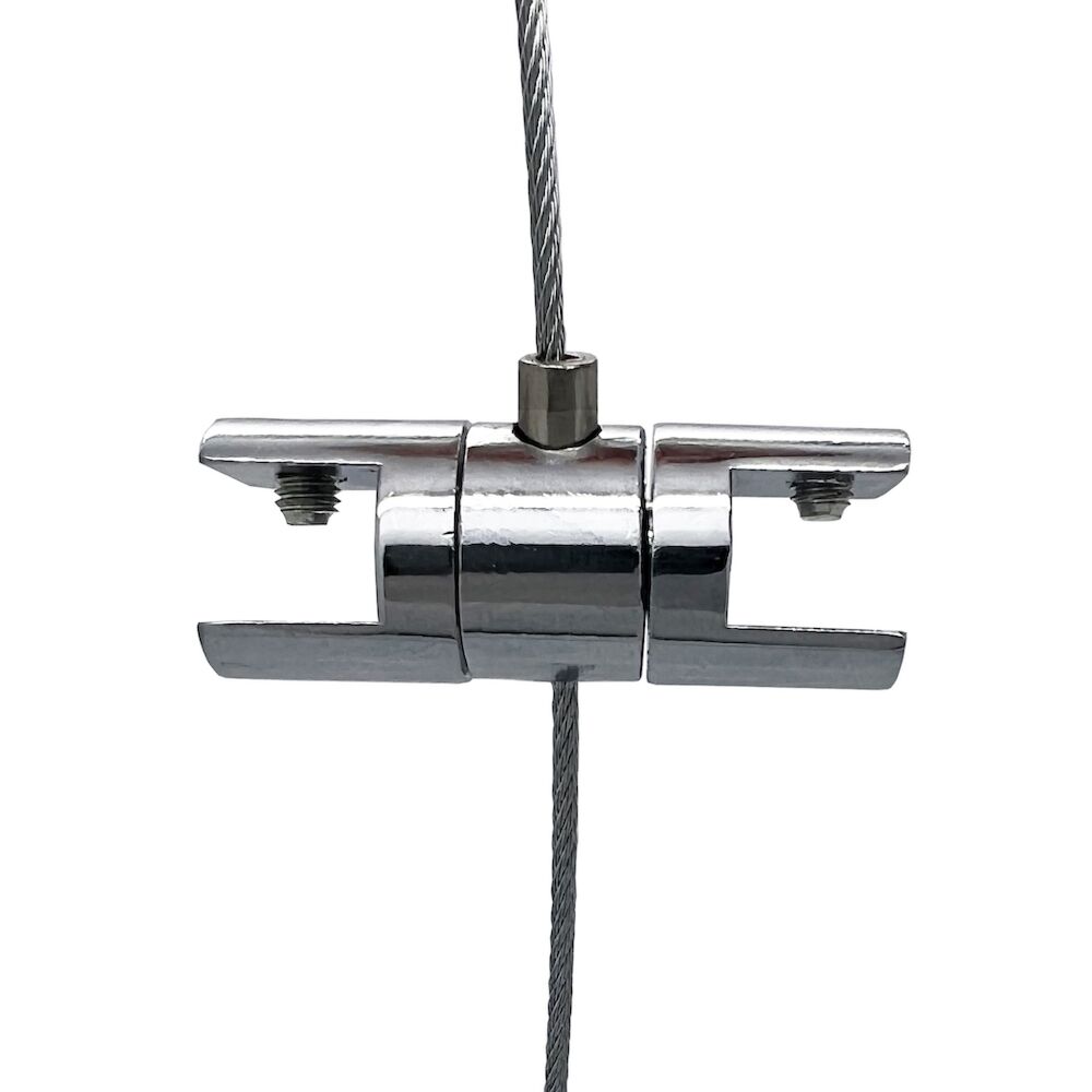 This double clamp rotates 360 degrees and can hold 2 signs, shelves or panels vertically or horizontally. It can be used with 1.2mm - 2mm diameters of steel wire rope.