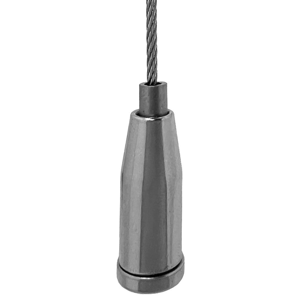 GS Products offer zinc plated adjustable wall or ceiling bullet shaped mounts. These suit 1.2mm, 1.5mm and 2mm diameter steel wire ropes.