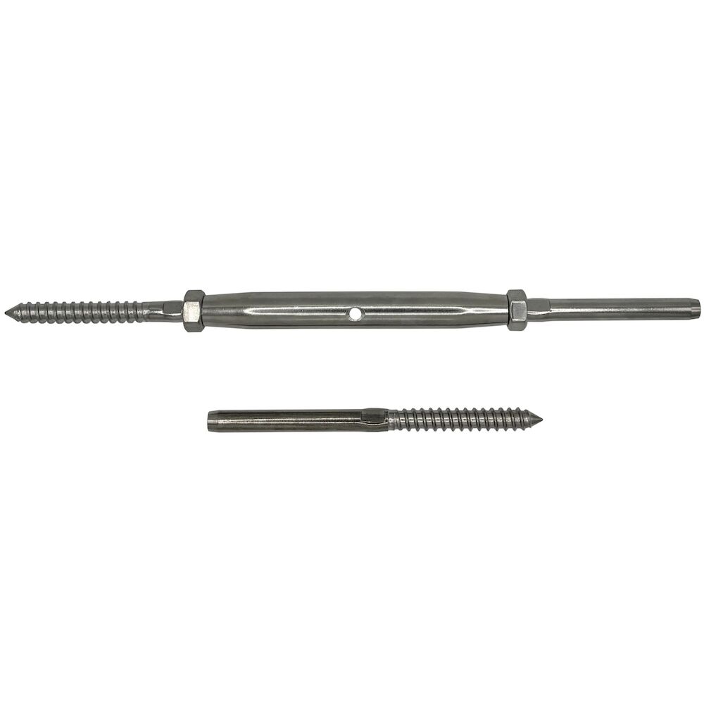 This set is for 4mm diameter stainless steel wire rope, it comes supplied with a swage woodscrew terminal and a swage wood screw adjustable rigging screw. You will need to hydraulically swage these fittings