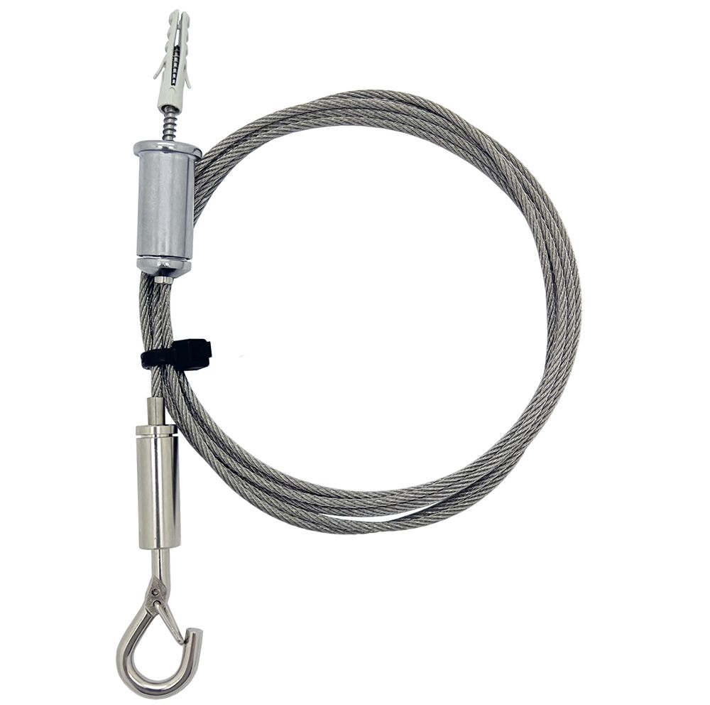 GS Products offers a handing ceiling wire rope cable hanging kit with ceiling mount and adjustable hook. It has a 2 meter maximum drop.