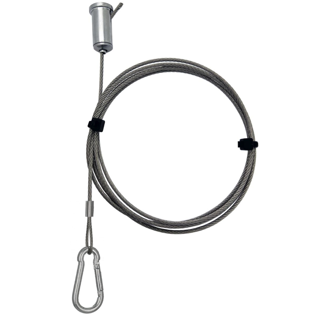 GS Products offer ceiling wire rope cable hanging kits with ceiling mounts and carbine snap hook ends with a 2 meter maximum drop.