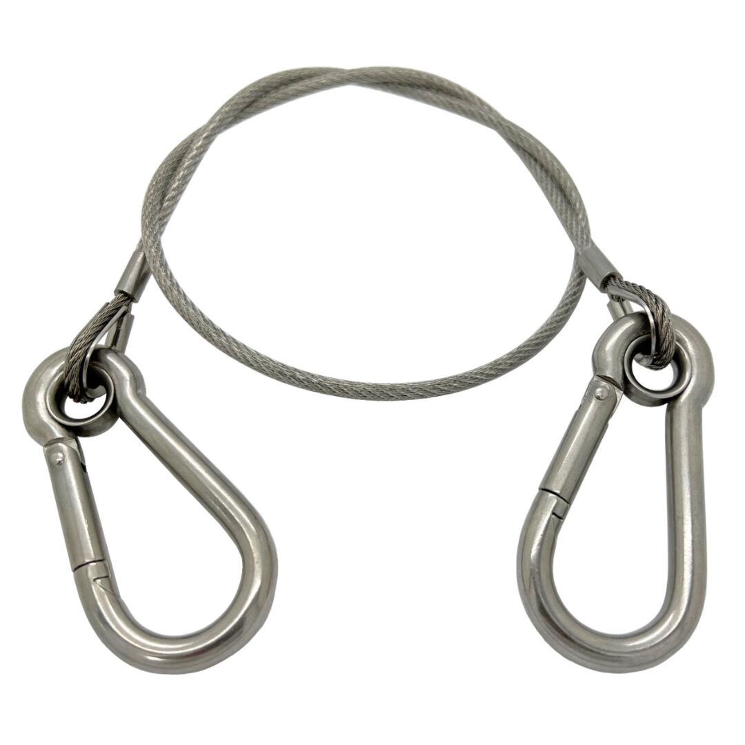 This cable can be used to secure outboard motors from loss. It is made from 3mm 7x7 stainless steel wire rope which has a breaking load of 559kg. The snap hooks are 80mm overall length.