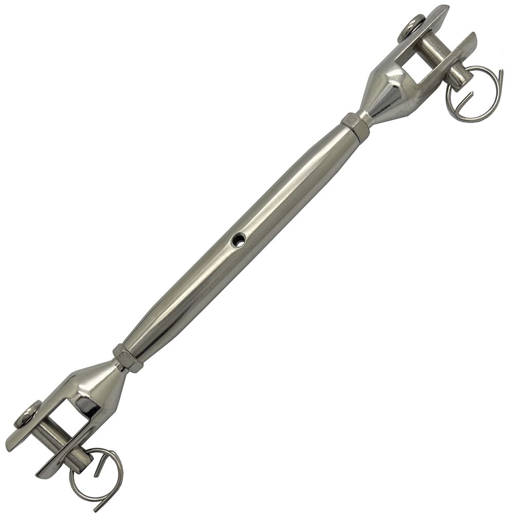 A4 - AISI 316 stainless steel rigging screws with machined fork ends, also known as tensioners or barrel strainers.