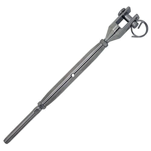 The adjustable tensioner has a machined jaw for added strength and is often used in architectural rigging and wire balustrades.