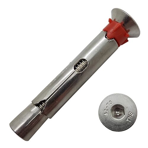 This stainless steel A2 sleeve anchor is a thin walled sleeve anchor suitable for use in concrete, stone, brickwork, perforated bricks and dense concrete blocks.